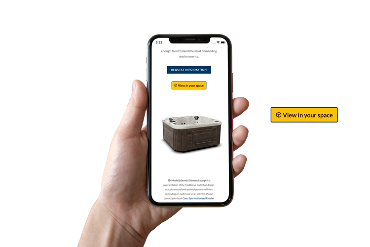 New Three dimensional (3D) models allow you to see our Spas and Swim Spas like never before. Now you can examine select Coast products from all angles, making it even easier to choose a design that fits your needs and lifestyle. These models can be viewed in Augmented Reality (AR) on almost all mobile phones. Augmented Reality allows you to place the 3D spa model in your own environment when viewed through your smart device, giving you an advanced view of how your spa will look in place.